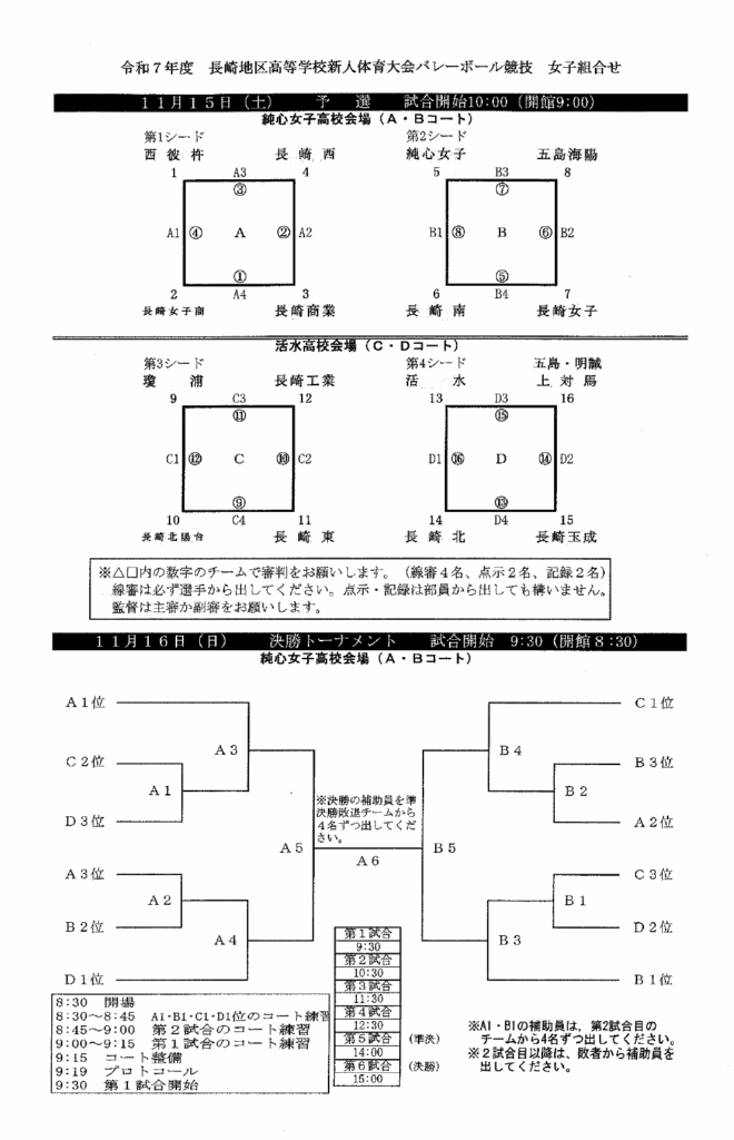 11月15日(土)から開催される『長崎地区新人大会の組合せ』と会場のお知らせとなります。